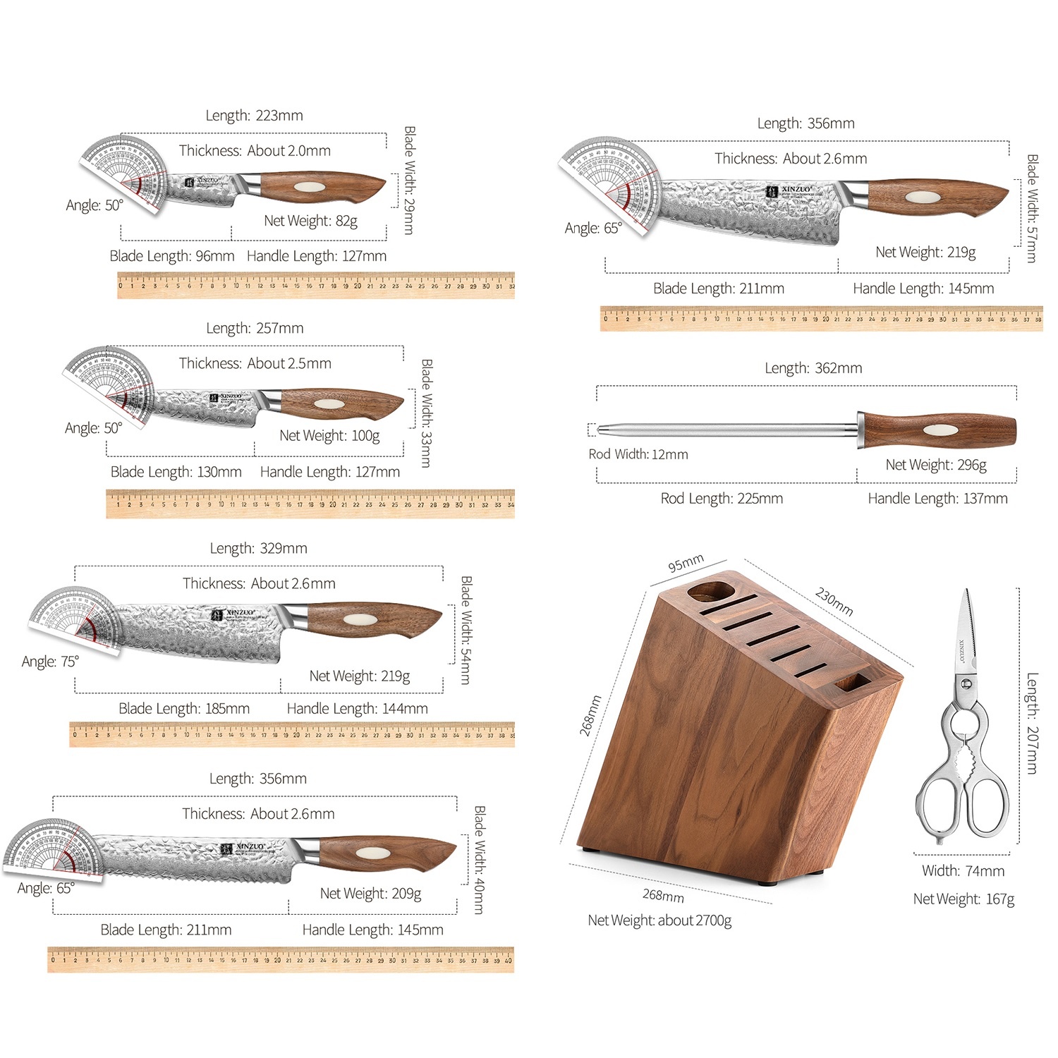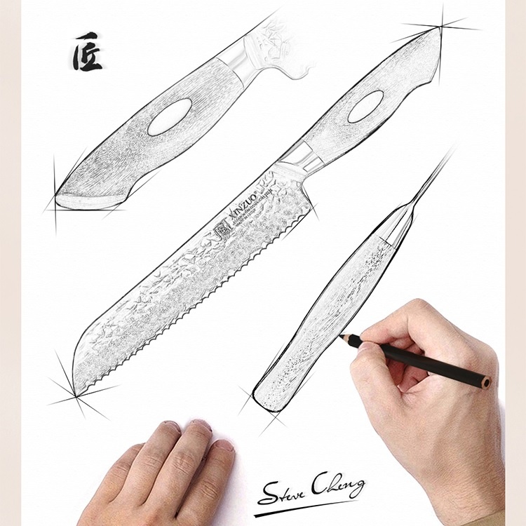 Het design van deze messen(set) is ontworpen door Steve Cheng. Het intrigerende Damascus patroon op het lemmet in combinatie met het donkere, rijke Walnoothouten handvat maakt dit mes niet alleen een praktisch keukengereedschap, maar ook een artistiek meesterwerk. De messenset wordt afgemaakt door het prachtige en zeer unieke schuine messenblok, wat de messen op een buitengewone manier tentoon stelt.