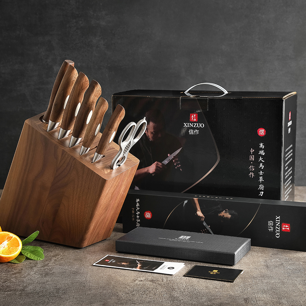 Deze luxe 8-delige messenset uit de XinZuo B46W Jiang Series staat symbool voor toewijding, vakmanschap en passie. Of u nu een professionele chef-kok bent of een enthousiaste thuiskok, deze set zal zeker indruk maken met zijn prestaties en esthetiek. Het is een waardevolle aanvulling op elke keuken en is een sterk voorbeeld van wat XinZuo te bieden heeft.