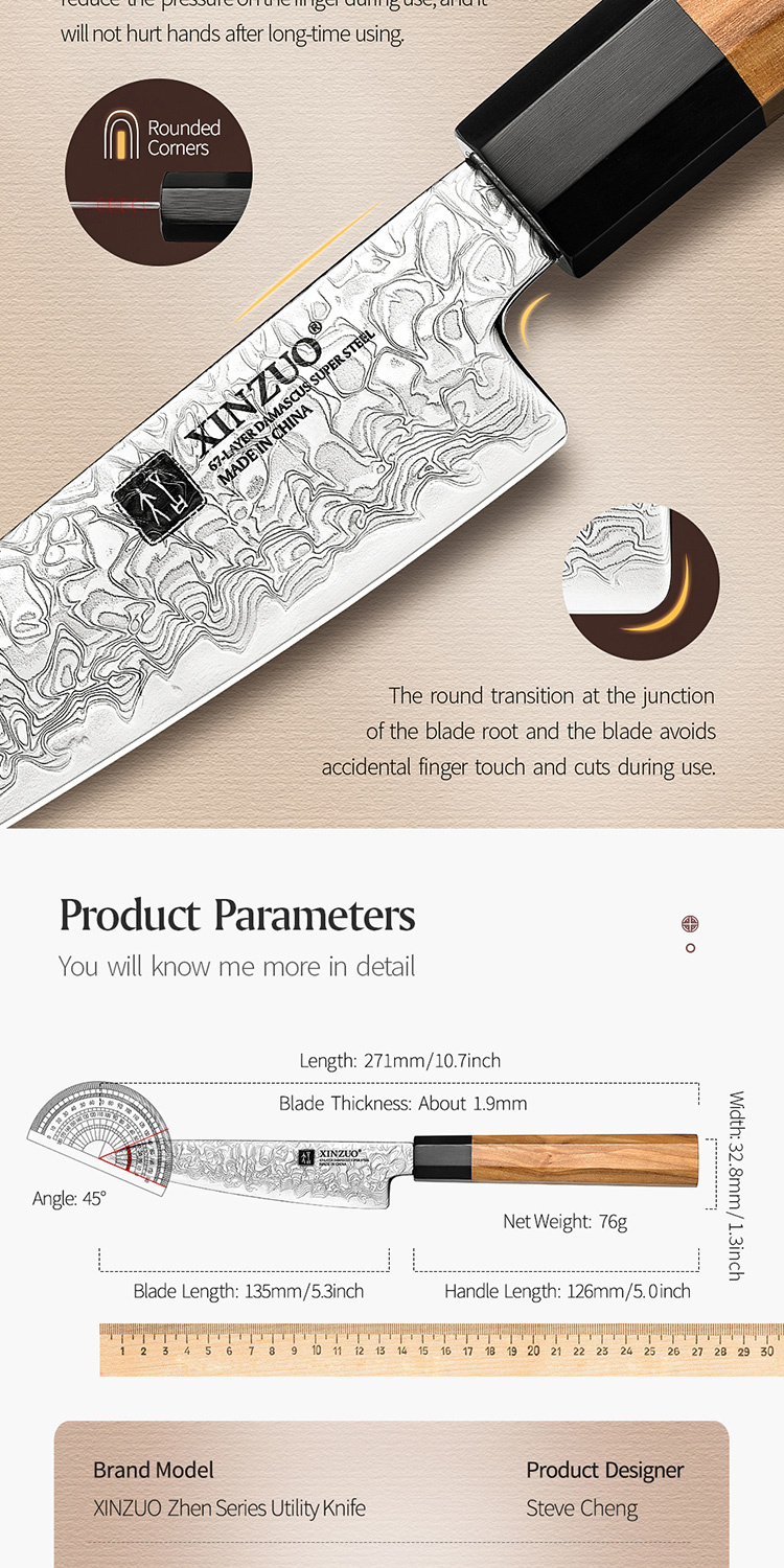 Een prachtig keukenmes uit de PM8O Zhen Series van het populaire Chinese messenmerk XinZuo. Het PM8O Groentemes is een professioneel mes met een prachtig lemmet van 67 laags Damaststaal met een kern van 10Cr15CoMoV staal. Dankzij de kwaliteit van het staal en de geavanceerde vacuüm heat-treatment techniek heeft het mes een hoge hardheid (58-62 HRC) en blijft het uitzonderlijk lang scherp. Het mes is tot in de fijnste details zorgvuldig afgewerkt, waardoor het een plezier is om mee te werken. Het handvat heeft een octogonaal handvat (Japanse stijl) en is vervaardigd uit Europees Olijfhout.