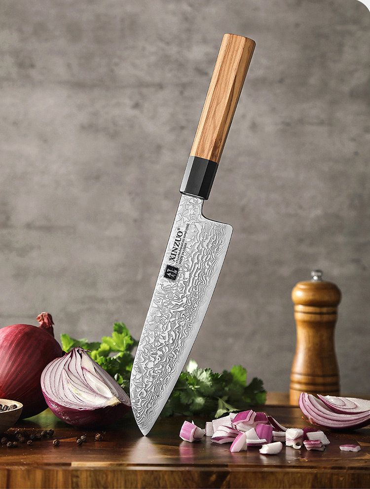 Een prachtig keukenmes uit de PM8O Zhen Series van het populaire Chinese messenmerk XinZuo. Het PM8O Santokumes is een professioneel mes met een prachtig lemmet van 67 laags Damaststaal met een kern van 10Cr15CoMoV staal. Dankzij de kwaliteit van het staal en de geavanceerde vacuüm heat-treatment techniek heeft het mes een hoge hardheid (58-62 HRC) en blijft het uitzonderlijk lang scherp. Het mes is tot in de fijnste details zorgvuldig afgewerkt, waardoor het een plezier is om mee te werken. Het handvat heeft een octogonaal handvat (Japanse stijl) en is vervaardigd uit Europees Olijfhout.