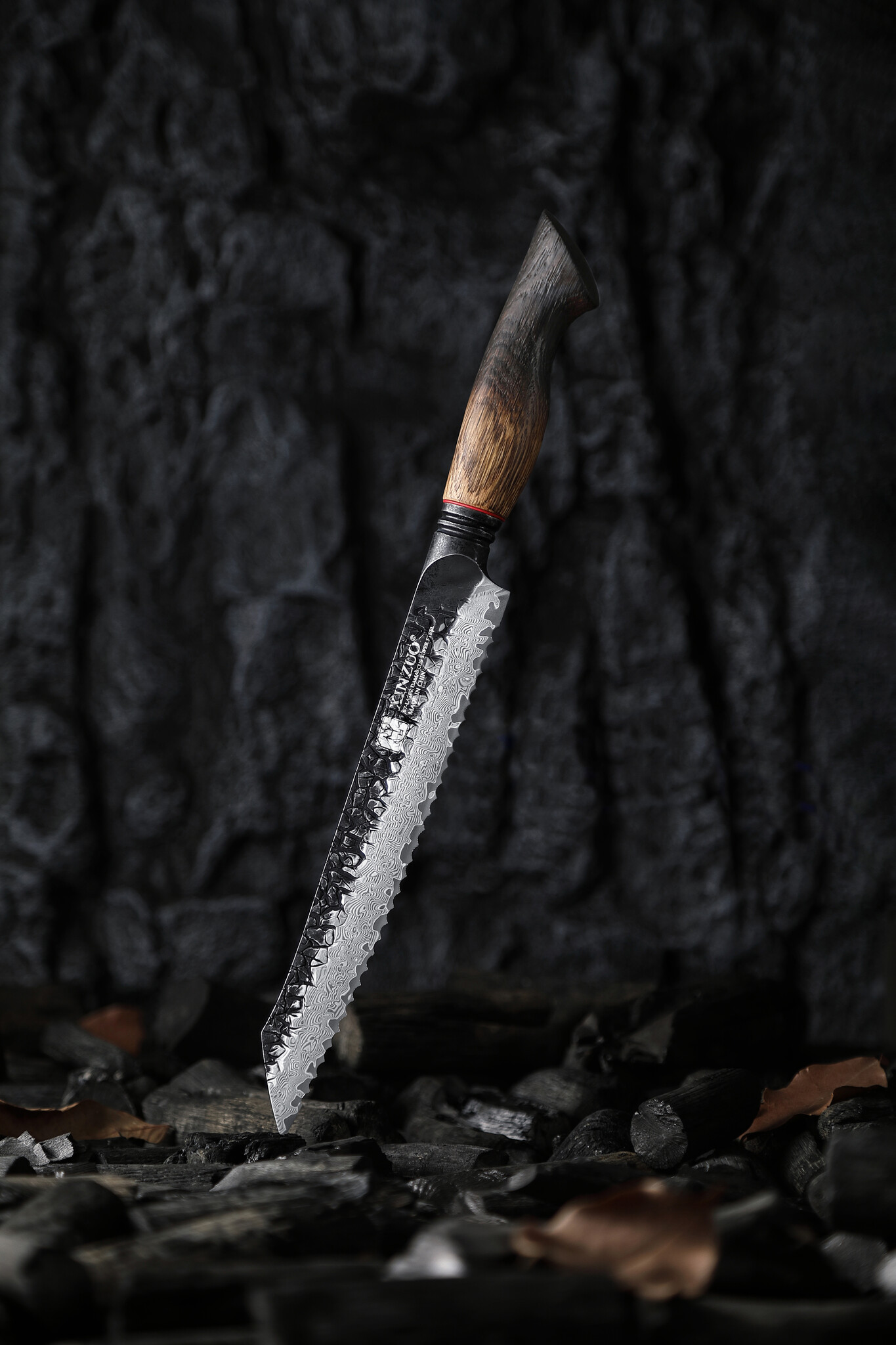 Het broodmes uit de XinZuo X06 Mo Series is speciaal ontworpen voor het moeiteloos snijden van brood, harde korsten en zachte binnenkanten zonder te scheuren of te duwen. Dankzij het lange, gekartelde lemmet glijdt dit mes moeiteloos door brood, stokbrood, taarten of stevige groenten zoals pompoen. Het lemmet bestaat uit 67 lagen Damaststaal met een kern van 10Cr15CoMoV-staal en is behandeld met een geavanceerd vacuüm- en diepvriesproces voor extra hardheid (58-62 HRC). De kartels zijn geslepen tot een hoek van 30 graden per zijde voor een krachtige en efficiënte snede. Het handvat van gebrand Noord-Amerikaans wit eikenhout met rode G10 tussenlaag biedt een stevige, comfortabele grip. De zwarte titanium stonewash-afwerking en retro-stijl geven het mes een robuuste uitstraling.