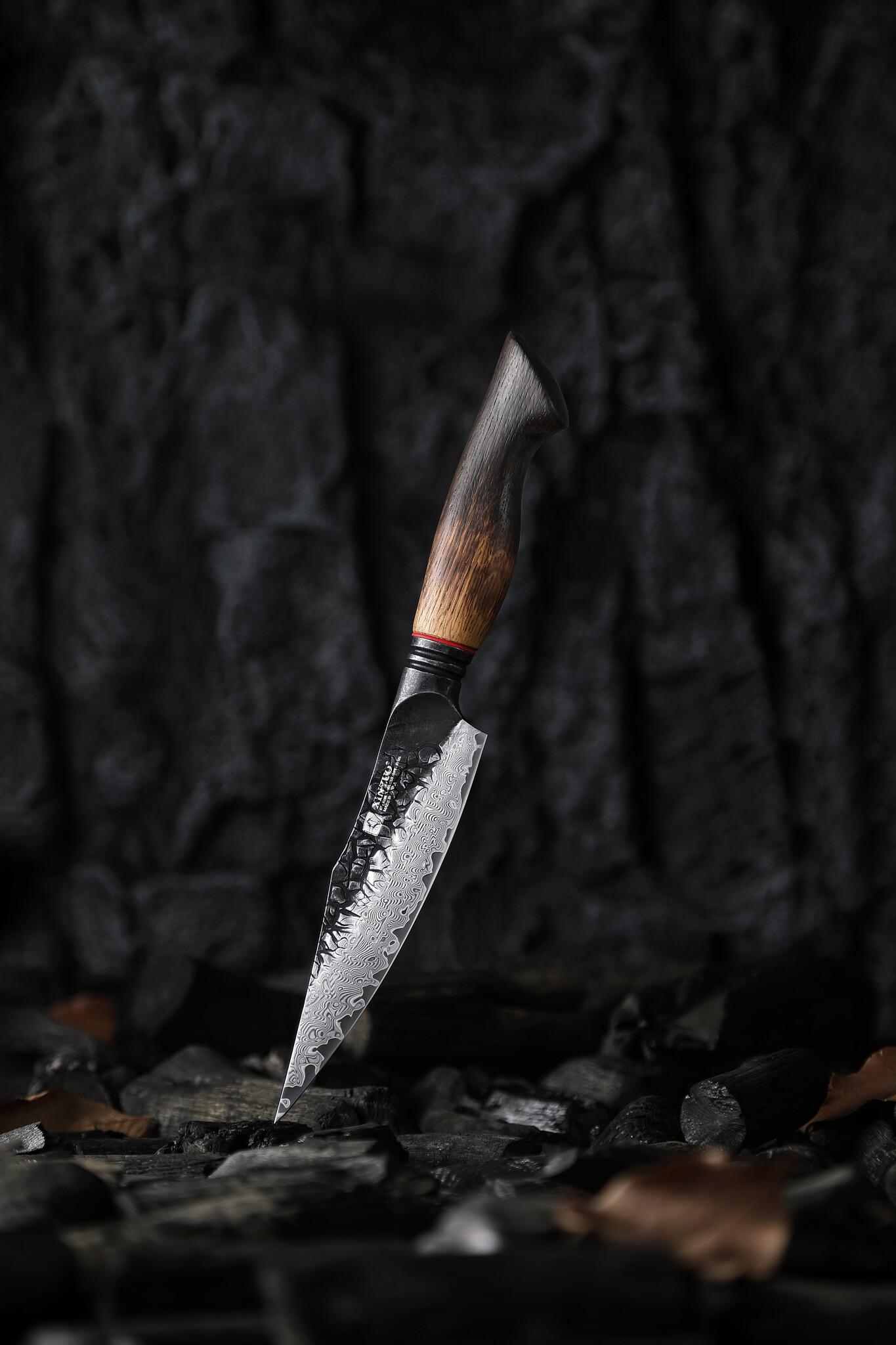 - Het handvat is zwart gebrand volgens de traditionele Shou Sugi Ban-techniek en afgewerkt met een rode G10-spacer.