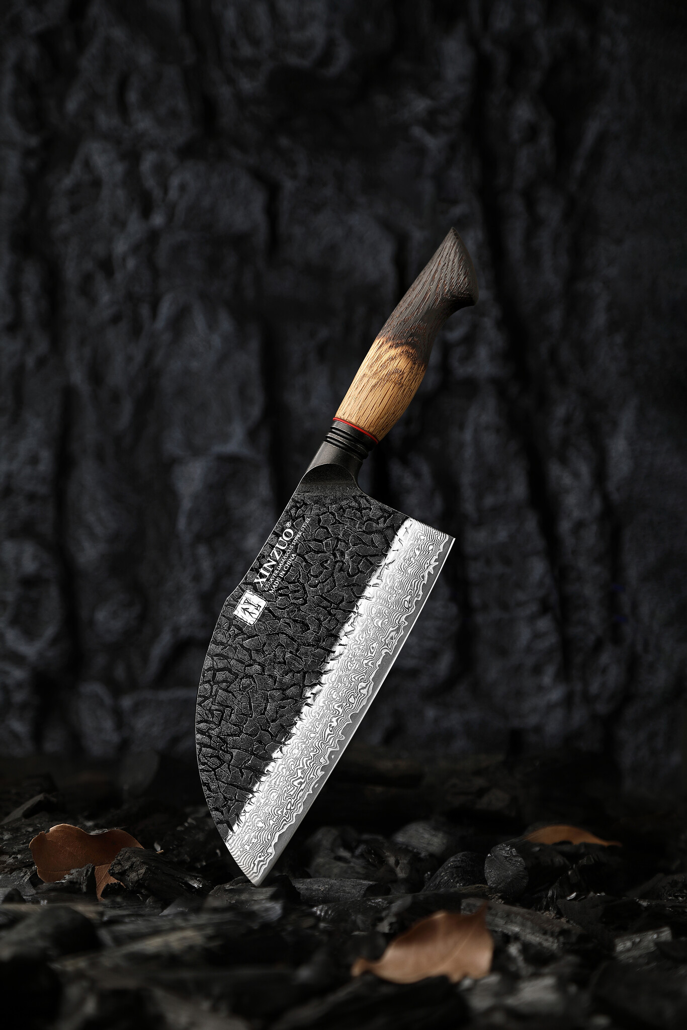 Het Hakmes van de XinZuo X06 Mo Series is een robuust en krachtig keukenmes dat direct opvalt door zijn bijzondere vorm met een afgebogen voorkant. Dit unieke ontwerp geeft het mes een stoer karakter en maakt het een echte blikvanger binnen de serie. Het zware lemmet van 18,5 cm is ideaal voor stevige snijtaken en perfect geschikt voor gebruik bij de barbecue. Dankzij het brede en sterke blad kun je eenvoudig door grote stukken vlees en botten hakken. Het lemmet is opgebouwd uit 67 lagen Damaststaal met een kern van 10Cr15CoMoV-staal, behandeld met een geavanceerd vacuüm- en diepvriesproces voor extra hardheid (58-62 HRC) en langdurige scherpte. In tegenstelling tot de meeste messen uit deze serie is de snede met de hand geslepen tot een hoek van 27 graden per zijde, zodat het mes extra robuust is en zonder beschadiging door botten kan hakken. Het handvat van gebrand Noord-Amerikaans wit eikenhout met rode G10 tussenlaag ligt stevig en comfortabel in de hand. Samen met de zwarte titanium stonewash-afwerking en retro-stijl krijgt dit mes een stoere outdoor-uitstraling.