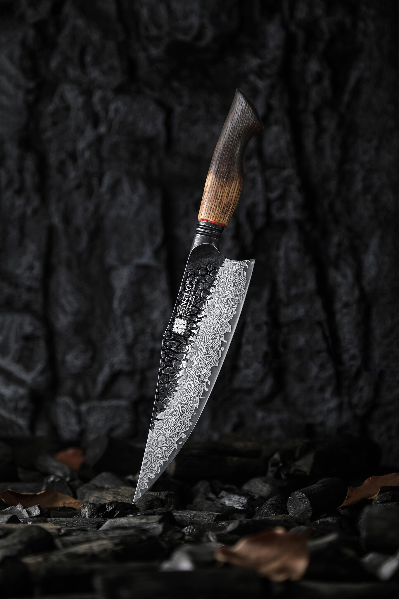 Het Koksmes van de XinZuo X06 Mo Series is een krachtig en stijlvol keukenmes voor dagelijks gebruik. Het lemmet is opgebouwd uit 67 lagen Damaststaal met een kern van 10Cr15CoMoV-staal, behandeld met een geavanceerd vacuüm- en diepvriesproces voor extra hardheid (58-62 HRC) en langdurige scherpte. De snede is met de hand geslepen tot een hoek van 15 graden per zijde, ideaal voor nauwkeurig en moeiteloos snijden. Het handvat van gebrand Noord-Amerikaans wit eikenhout met rode G10 tussenlaag zorgt voor een comfortabele, stevige grip. Dankzij de zwarte titanium stonewash-afwerking en de retro-stijl heeft het mes een stoere, robuuste outdoor-uitstraling.