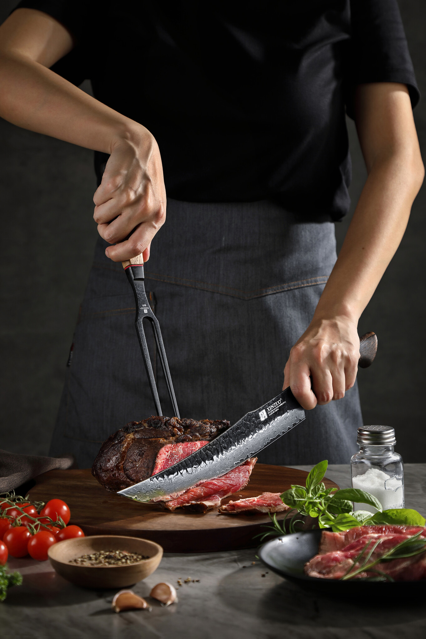 De Vleesvork van de XinZuo X06 Mo Series is een stijlvolle en functionele aanvulling op uw keukenuitrusting. Met zijn stevige tanden van 15 cm is deze vork ideaal voor het vastzetten en aansnijden van gebraad, rollades en gevogelte, maar ook perfect voor gebruik bij de barbecue. Het lemmet is vervaardigd uit hoogwaardig 430 roestvrij staal en volledig afgewerkt met een weathered black titanium stonewash finish. Deze behandeling, gecombineerd met een gepolijste en handgeblaste textuur, geeft de vleesvork een stoere vintage uitstraling.