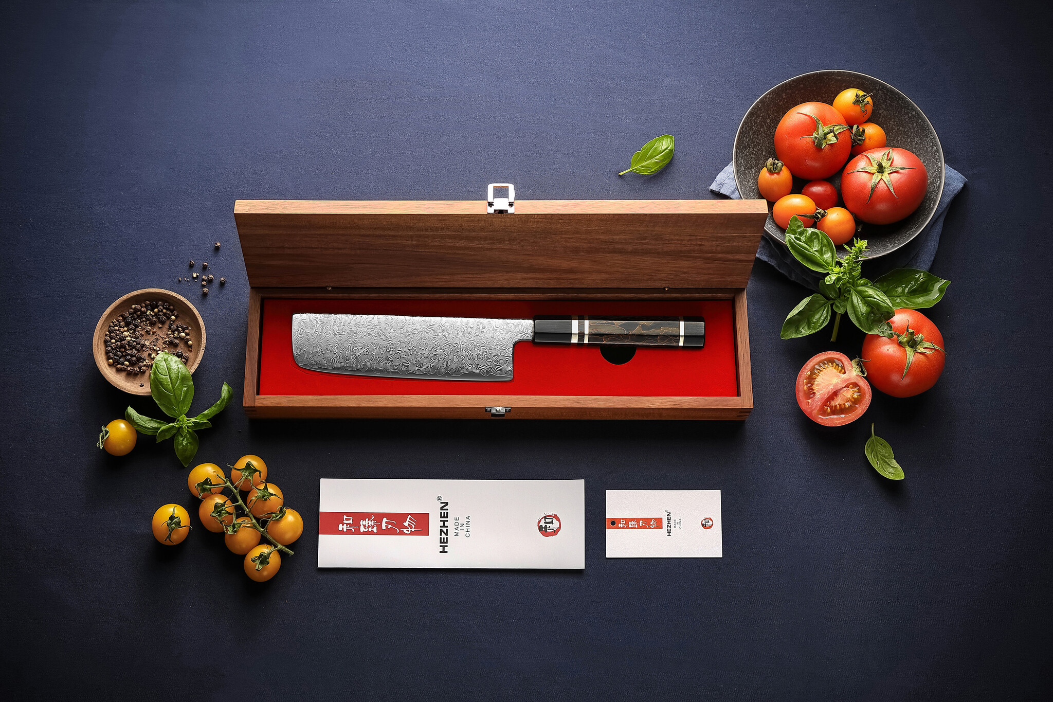 Het Nakiri mes van de Hezhen X09 Retro Series is een traditioneel Japans groentemes, ontworpen voor ultieme precisie bij het snijden, hakken en fijnsnijden van groenten en kruiden. In tegenstelling tot een koksmes heeft de Nakiri een breed, recht lemmet, waardoor je in één vloeiende beweging door ingrediënten snijdt zonder dat er stukjes ongesneden achterblijven. Dit maakt de Nakiri uniek en bijzonder geliefd bij chefs die perfecte, gelijkmatige sneden willen bereiken.
